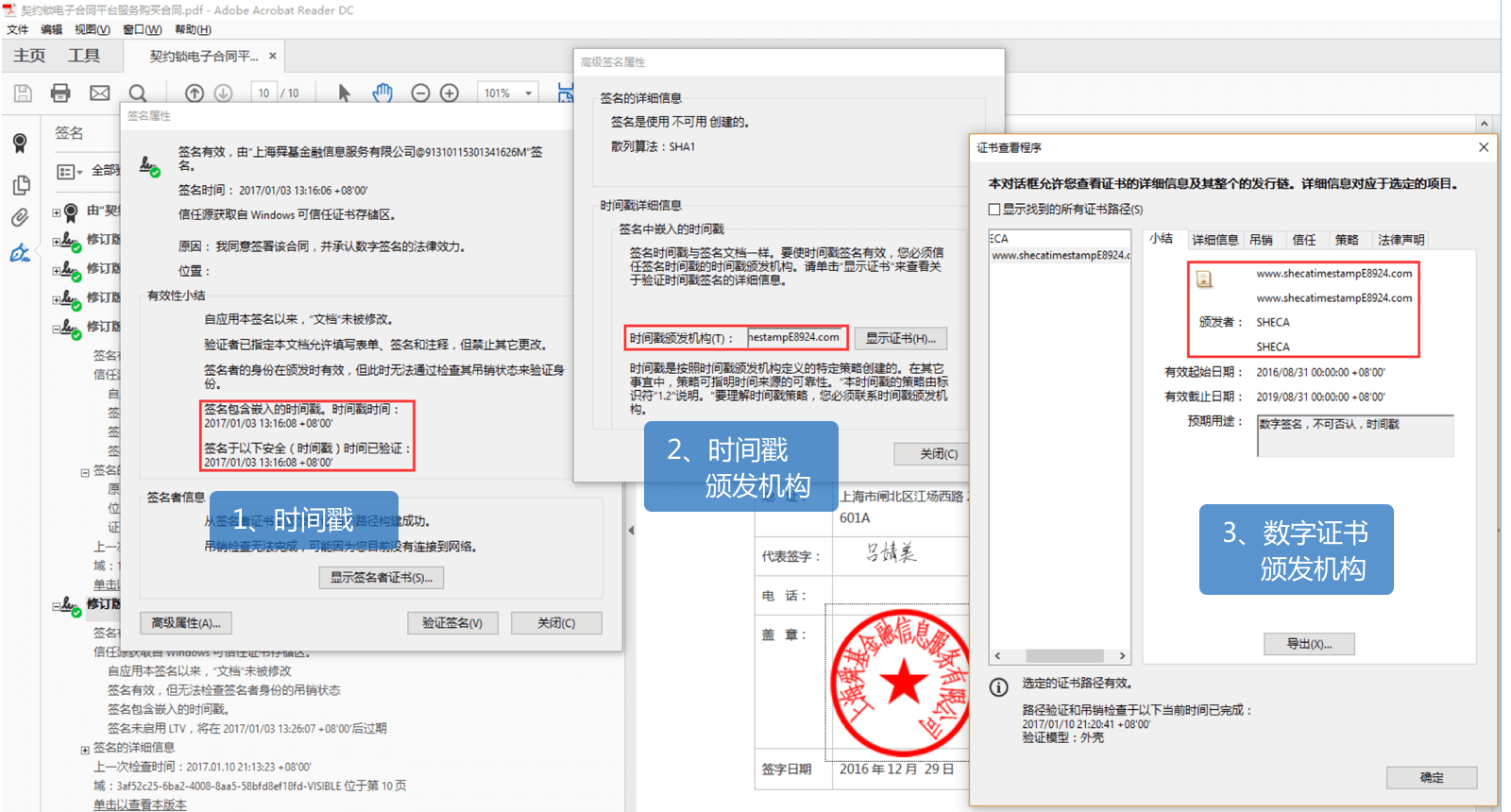 1、【时间戳】-电子印章每次签署后,都在签署文件中增加时间戳,时间戳由国家授时中心实时颁发,用以证明签署时间。